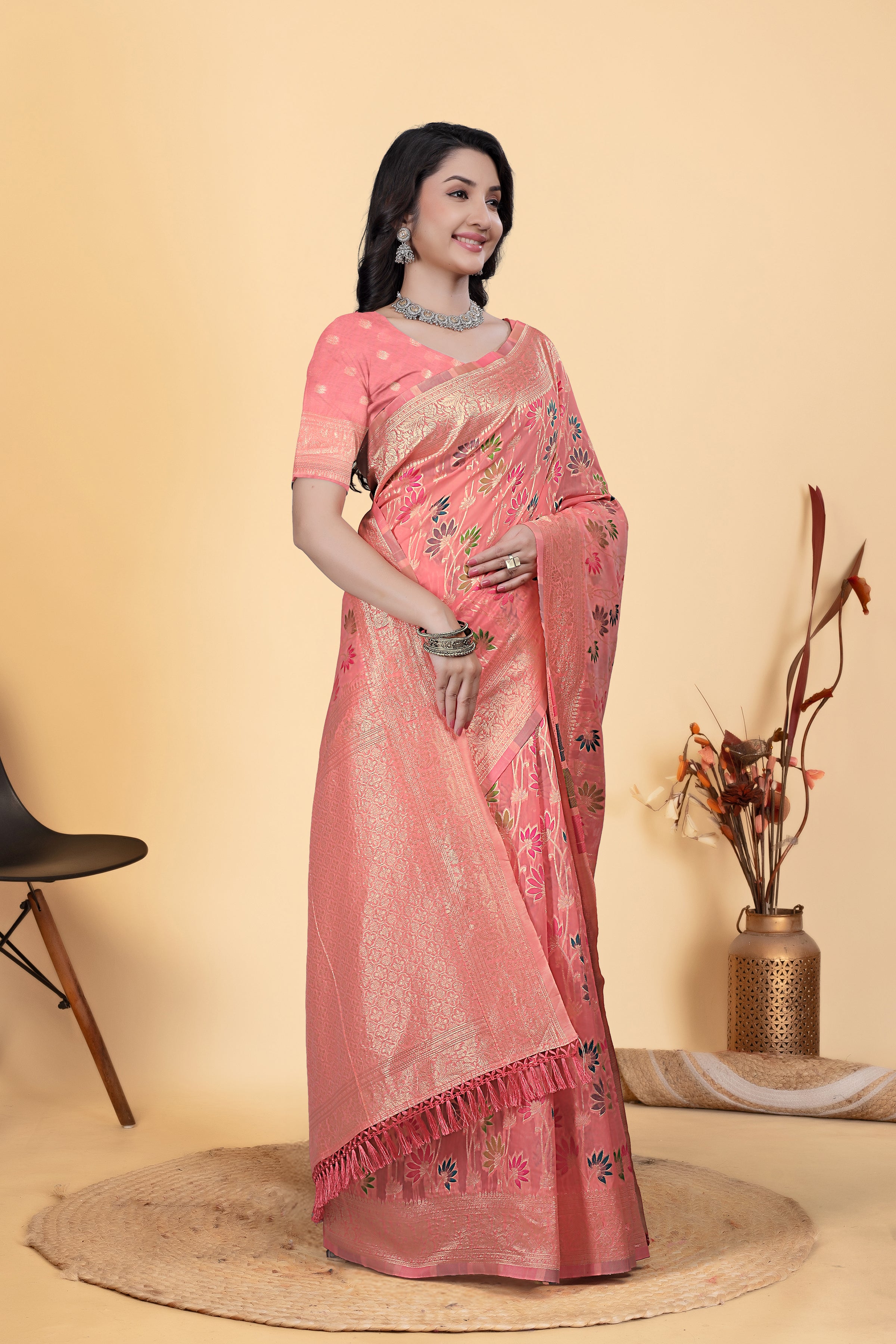 Peach Jaal Flower Cotton Saree